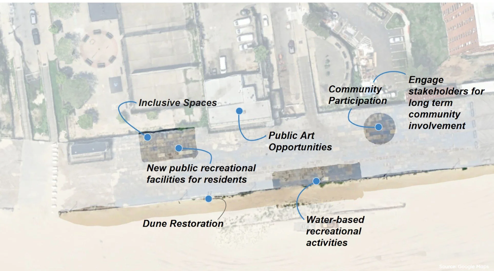 Diagrams: Proposed Improvements in Kaiser Park and the Coney Island Boardwalk (Source: Jasmin Malhotra)